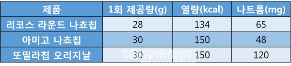 나쵸칩 3종의 나트륨함량은 1회 제공량(30g) 기준 ‘리코스 라운드 나쵸칩(65mg)’, ‘아미고 나쵸칩(48mg)’, ‘또띨라칩 오리지날(120mg)’였다.