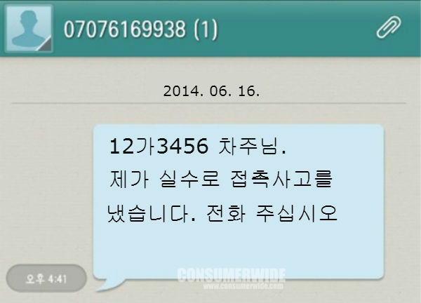 [컨슈머와이드-전진성 기자] 누군가에서 문자가 한통 도착했는데 그 문자에는 "죄송합니다. 12가3456 차주님. 제가 접촉사고를 냈습니다. 전화 주십시오."라고 적혀 있었다. 그래서 깜짝 놀라서 서둘러 걸려 온 전화번호로 전화를 걸었다. 전화가 연결되었지만 오래도록 상대방의 음성이나 소리를 들을 수 없어 혼자만 "여보세요~?"를 연발하다 끊었다.
