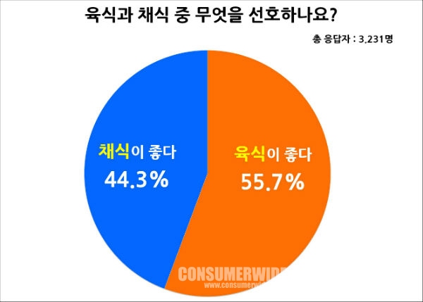 척추관절전문 장형석한의원은 온라인 리서치패널을 통해 만 18~65세 성인 남녀 3,231명을 대상으로 ‘육식과 채식의 선호도’에 대해 조사했다. 그 결과, 55.7%인 1,799명이 ‘육식이 좋다’고 밝혔다. 이는 채식 선호도(44.3%, 1,432명)와 11.4% 차이를 보였다.