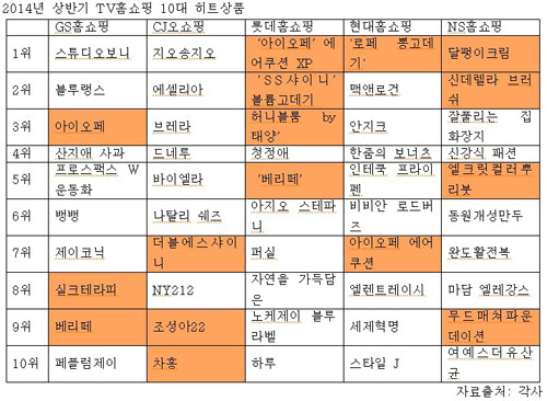본지가 GS홈쇼핑, CJ오쇼핑, 롯데홈쇼핑, 현대홈쇼핑, NS홈쇼핑 등 5대 TV홈쇼핑사의 상반기(1월1일~5월31일) 10대 히트상품을 비교 분석해 본 결과, 아모레퍼시픽의 아이오페 에어쿠션과 LG생활건강의 베리떼, 조성아 22 등이 10위권에 이름을 올렸다. 기초화장품은 엘렌실라 달팽이크림을 제외하곤 전멸했다.
