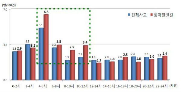 시간대별로는 새벽~오전 시간대인 4시~ 12시 사이에 장마철 빗길 사고 치사율이 평소에 비해 50% 이상 높아지는 것으로 나타나, 장마철에는 새벽시간대 교통안전에 각별히 유의할 필요가 있는 것으로 분석되었다.