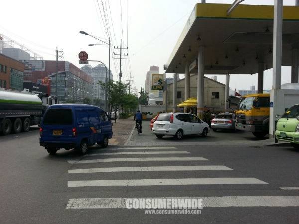 - 횡단보도를 밟고 넘어 LPG 충전소 진입하는 차량들