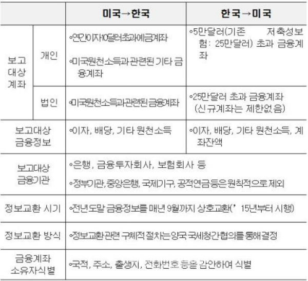 FATCA는 미국이 자국 납세자의 해외금융정보를 파악하기 위해 만든 법으로 금융위원회는 FATCA 이행을 위하여 14년 6월 18일 ‘정기 금융정보 교환을 위한 조세조약 이행규정’을 제정, 7월 1일부터 시행한다.