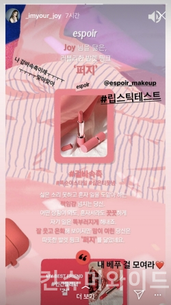조이는 지난 7일 자신의 SNS에 립스틱 테스트 결과를 올렸다. 공개된 테스트는 에스쁘아에서 개개인의 MBTI 성향 기반으로 에스쁘아 립스틱을 추천해주는 ‘나를 닮은 생일 립스틱 만들기’라는 심리 테스트다.