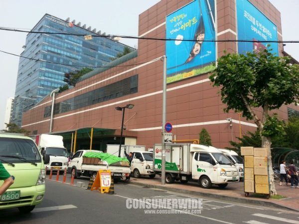 [컨슈머와이드-전진성 기자] 이른 아침부터 도로 한쪽 진입로를 가득 메운 차량들에서는 쉴새없이 다양한 물품들을 쏟아내느라 정신이 없다. 하역 중인 차량 외에도 이미 많은 차량들이 보도를 점유했고, 길게 늘어선 차량들은 꼬리 물고 이어지다, 결국 진입로 옆 주도로 한쪽 라인마저 점유하였다.