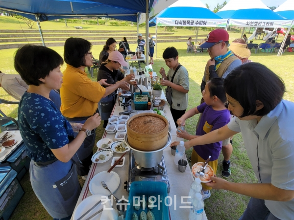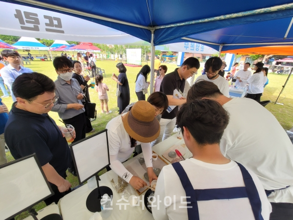 또 다른 부스도 인기를 끌었다. 이 곳은 표고버섯을 피자도우로, 토핑은 대체육 닭고기를 사용한 비건미니피자를 선보였다. 이 곳에서도 관람객들의 맛있다는 평가가 줄을 이었다. 관계자 채희정 씨는 "저는 임업후계자다. 괴산에서는 표고버섯이 많이 나는데 표고버섯은 임산물에 들어간다. 그래서 농산물을 알리려고 나왔다"면서"오늘 시식으로 내놓은 비건미니피자에는 밀가루 대신 표고버섯을 도우로 사용했고 피자토핑에는 다양한 채소와 대체육 닭고기를 사용했다. 먹어본 분들이 다들 '표고버섯이 이렇게 맛있냐','대체육이 아니라 진짜 고기인 줄 알았다'며 놀라셨다. 3세 아이도 계속 먹더라. 아이들은 물컹거리는 식감 때문에 버섯을 싫어하는데 이렇게 구워서 주면 쫄깃해져 좋아한다. 채소를 맛있게 골고루 먹고, 먹일 수 있어 엄마들이 좋아한다"고 말했다.