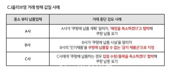 최근 쿠팡은 올리브영을 납품업체 갑질로 공정위에 신고했다. 또한 올리브영의 갑질 정황과 증거가 담긴 추가 자료를 제출했다. 추가로 제출한 자료에는 올리브영이 납품업체와 계약서에 상품명과 쿠팡 등 경쟁사를 명시하고 “납품하려면 사전 협의를 받아야 한다”고 적시한 계약서와 올리브영에 납품해온 업체들의 쿠팡 납품을 가로막은 정황 등이다.
