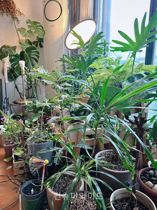 그녀는 “이전 직장에서 사무실에 대형 화분을 여러 개 길렀었다. 대품(식물 중에 큰 상품)은 성장이 빠르다보니 가지치기를 1년에 한 번씩 해줘야 하는데, 잘려나간 가지들이 너무 딱해서 집에 가져왔다. 그렇게 한 줄기 가지를 심어 두 그루로 키우는 식이었다”면서 “선인장도 세 그루로 자랐어요. 화원에서 사온 작은 몬스테라도 성장해 지금은 화분 3개로 자랐다”고 말했다.