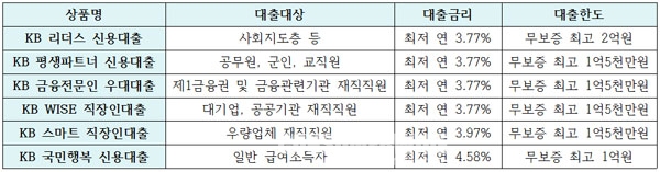 신규 대출상품은 ▲KB 리더스 신용대출 ▲KB 평생파트너 신용대출 ▲KB 금융전문인 우대대출 ▲KB WISE 직장인대출 ▲KB 스마트 직장인대출 ▲KB 국민행복 신용대출 등 6종으로 구성되어 있다.