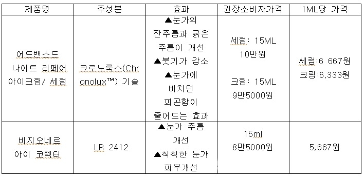 어드밴스드 나이트 리페어 아이 중 세럼은 15ML 용량에 10만원이다. 크림은 15ML 용량에 9만5000원이다. 비지오네르 아이 코렉터는 15ML 용량에 8만5000원이면 구매가 가능하다. 권장소비자가격면에서만 보면 에드밴스드 나이트 리페어가 비지오네르 아이코렉터보다 적게는 1만원 많게는 1만5000원 비싸다.