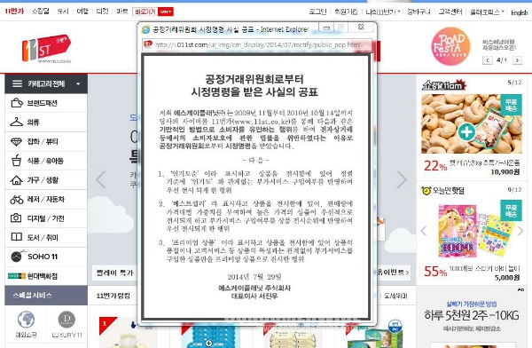 [컨슈머와이드-전진성 기자] 오픈마켓 선두주자인 11번가의 에스케이플래닛(주)이 7월 29일자로 공정거래위원회로부터 기만적인 방법으로 소비자를 유인하는 행위를 하여 전자상거래 등에서의 소비자 보호에 관한 법률을 위반하였다는 이유로 시정명령을 받고, 홈페이지 상에 시정명령문을 게재 공고하였다.