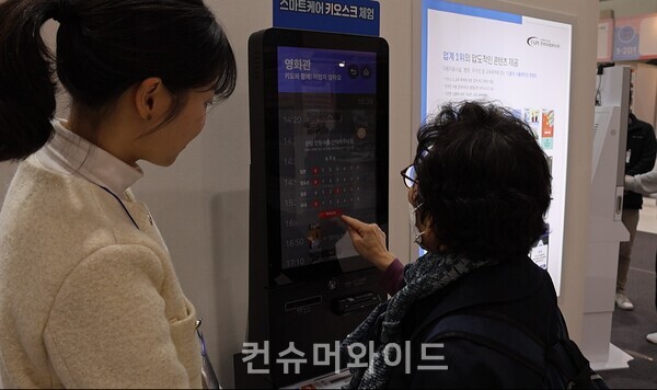 사진: 키오스크 체험을 하고 있는 여성 시니어/ 전휴성 기자 [컨슈머와이드-전휴성 기자] ‘2023 시니어 라이프 스타일 박람회’에서 한 여성 시니어가 도우미의 도움을 받으며 키오스크 체험을 하고 있다.