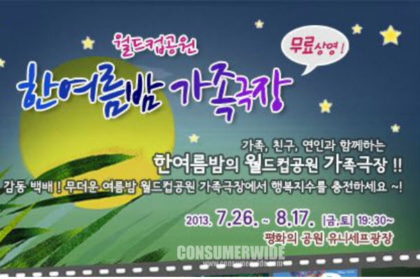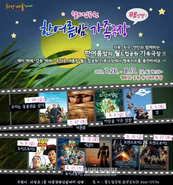 서울시는 여름방학을 맞이하여 마포구 상암동 월드컵공원 내 평화의공원 유니세프광장에서 8월 1일(금)부터 8월 23일(토)까지 저녁 8시, 총 9회에 걸쳐‘한여름밤 가족극장’을 무료로 운영한다고 밝혔다.
