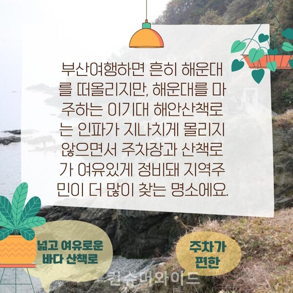 [컨슈머와이드-복요한 기자] 부산여행하면 흔히 해운대를 떠올리지만, 해운대를 마주하는 이기대 해안산책로는 인파가 지나치게 몰리지 않으면서 주차장과 산책로가 여유있게 정비돼 지역주민이 더 많이 찾는 명소에요.