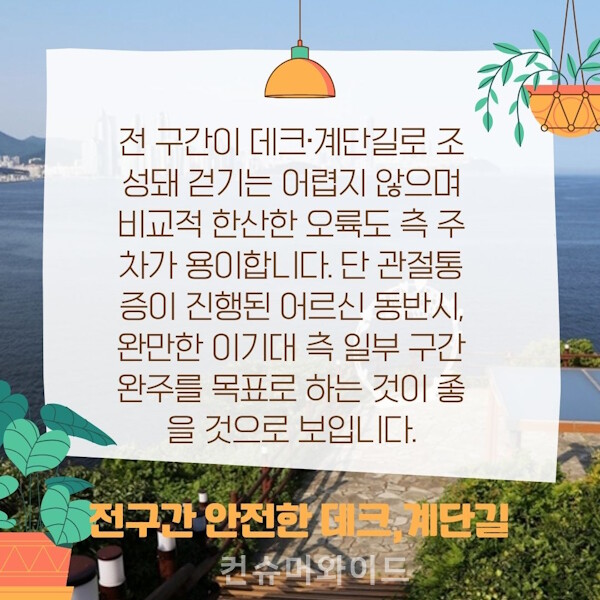 전 구간이 데크·계단길로 조성돼 걷기는 어렵지 않으며 비교적 한산한 오륙도 측 주차가 용이합니다. 단 관절통증이 진행된 어르신 동반 시, 완만한 이기대 측 일부 구간 완주를 하는 것이 좋을 것으로 보입니다.