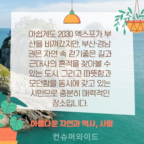 아쉽게도 2030 엑스포가 부산을 비껴갔지만, 부산·경남권은 자연 속 걷기좋은 길과 근대사의 흔적을 찾아볼 수 있는 도시, 그리고 따뜻함과 모던함을 동시에 갖고 있는 시민으로 충분히 매력적인 장소입니다.