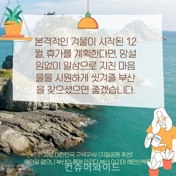 본격적인 겨울이 시작된 1,2월, 휴가를 계획한다면, 망설임없이 일상으로 지친 마음을을 시원하게 씻겨줄 부산을 찾으셨으면 좋겠습니다.