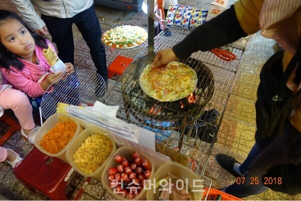 야시장 입구의 계단에 사람들이 몰려 있었다. 달랏 지역의 음식인 ‘반쨩느엉’을 먹기 위한 줄이었다. 나도 대열에 합류했다. 라이스페이퍼에 소스와 계란을 풀고 햄과 이름 모를 토핑을 올려 구워 주는 베트남식 피자였다. 옆에서 파는 요거트까지 사들고 자리를 잡아 한 입 베어 물었다. 너무 맛있어! 입안에 퍼지는 행복감에 좀전까지 실의에 빠졌던 상황은 잊었다. 바삭하고 짭조름한 맛에 빠져버렸다.