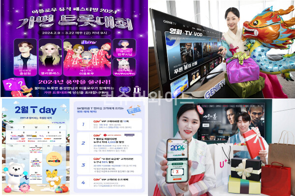 KT는 설 연휴 볼거리를 책임진다. 지니 TV에서 현재 극장에서 상영 중인 최신 영화와 설 연휴 온 가족이 함께 보기 좋은 영화들을 엄선해 ‘2024 푸른 용의 선물’ 설 특집관을 운영한다. 기간은 오는 13일까지 다. 이 기간 동안 지니TV 설 특별관을 통해 <서울의 봄>, <노량: 죽음의 바다>, <인투 더 월드> 등의 최신 영화10여 편 중 1편 이상 구매한 고객들을 대상으로 200명을 추첨해 이마트 상품권 5만 원권, 3편 이상 구매한 고객들에게는 TV포인트 5천 점을 전원 증정하는 이벤트를 진행한다. 또한 <댄싱퀸>, <그것만이 내 세상>, <탐정: 리턴즈> 등 온 가족이 볼만한 무료 영화 30여 편도 준비돼 있다. <콘크리트 유토피아>, <1947보스톤>, <한산: 리덕스> 등 등은 반값에 시청 가능하다. 오는 15일까지 키즈랜드에서도 ‘키즈랜드 설특집관’도 운영한다. <반짝반짝 캐치! 티니핑>, <고고다이노> 전 시즌 등 2,024편의 인기 애니메이션을 무료로 시청할 수 있다.