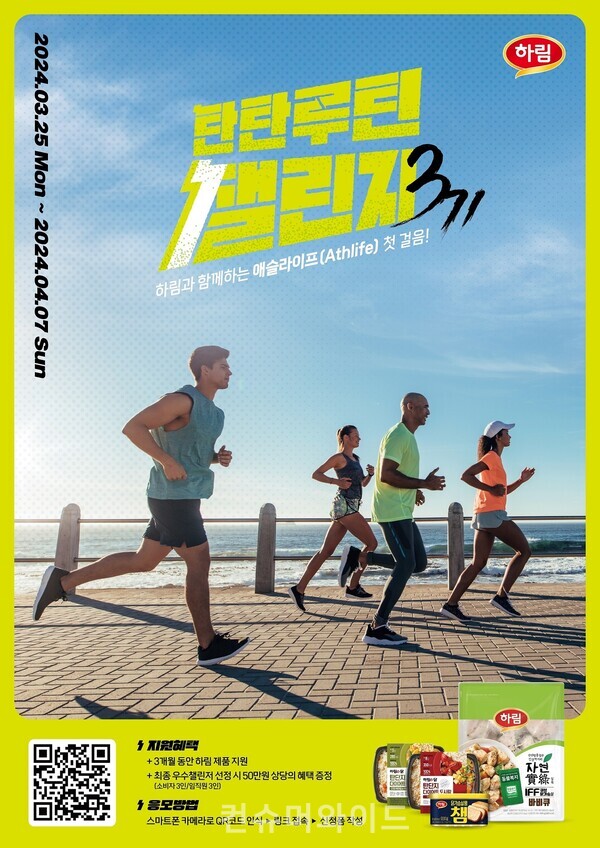 [컨슈머와이드-장하영 기자] 하림이 소비자와 임직원이 함께 건강하고 활력 있는 일상을 만드는 ‘2024 탄탄루틴챌린지’ 참여자를 모집한다. 이 챌린지는 소비자의 균형 잡힌 식단과 운동 루틴 형성을 위해 하림의 제품을 무상으로 제공하고 꾸준히 운동을 할 수 있도록 관리해 주는 프로그램이다.