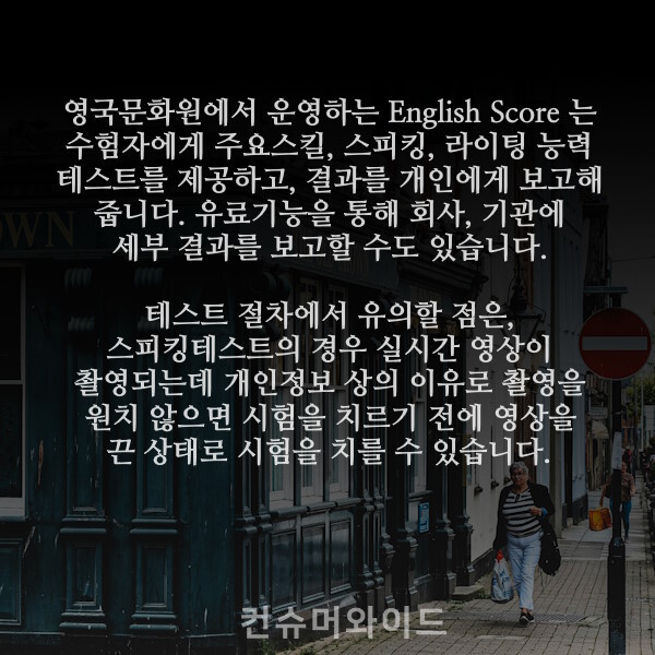 영국문화원에서 운영하는 'English Score'는 수험자에게 주요스킬, 스피킹, 라이팅 능력 테스트를 제공하고, 결과를 개인에게 보고해줍니다. 유료기능을 통해 회사, 기관에 세부 결과를 보고할 수도 있습니다.
