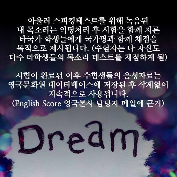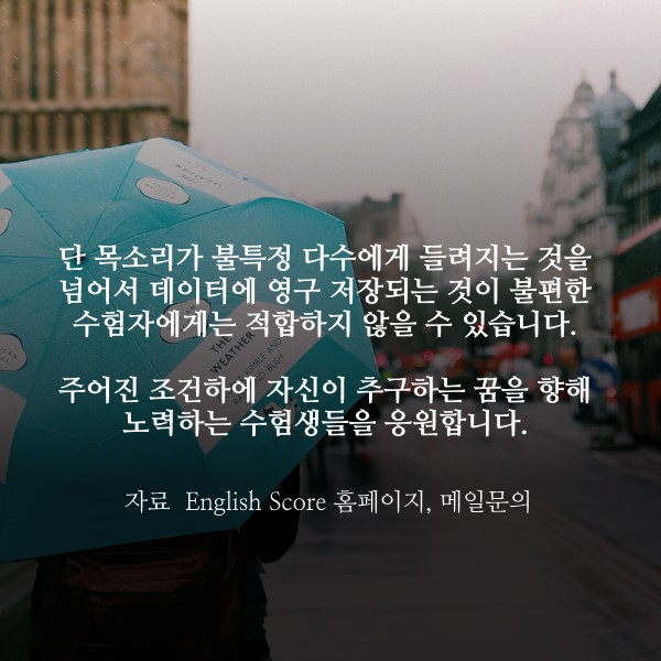 시험이 완료된 이후 수험생들의 음성자료는 영국문화원 데이터베이스에 저장된 후 삭제없이 지속적으로 사용됩니다. (English Score 영국본사 담당자 메일에 근거)