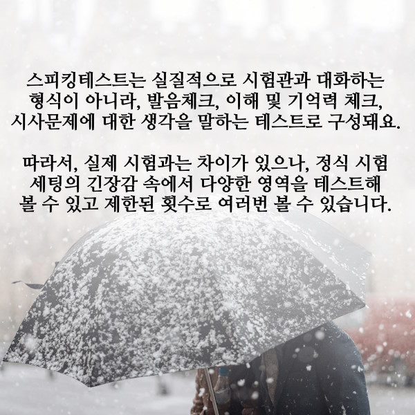 스피킹 테스트는 실질적으로 시험관과 대화하는 형식이 아니라, 발음 체크, 이해 및 기억력 체크, 시사문제에 대한 생각을 말하는 테스트로 구성돼요.