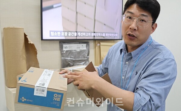 그러면서 “원티치 박스 위에는 테이프를 대체해서 송장을 붙이는 방식이다. 테이프 OPP 테이프를 제거하고 송장을 그대로 지금 바로 사용할 수 있도록 만들었다”면서 “개인 정보 보호를 위해서 바로 뜯어내면 된다. 테이프 제거 후에 송장을 제거하는 두 번의 번거로운 작업을 없앨 수가 있고, 고객의 개인 정보 보호에도 좀 더 용이한 구조다”고 부연했다.