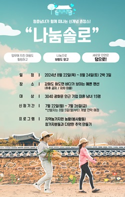 나눔솔로의 특징은 최근 젊은 층이 선호하는 ‘촌캉스’ 컨셉의 이색 봉사활동을 진행한다는 점이다. 참가자들은 오는 22일부터 2박 3일간 강화도에서 잡초 제거, 해변 환경 정화 등의 봉사활동을 하며 지역 사회에 도움을 줄 예정이다. 또, 함께 진행되는 소통 프로그램을 통해 자연스러운 만남의 기회도 가질 계획이다.