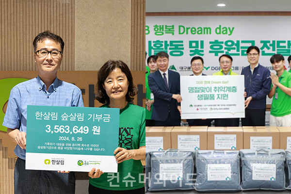 [컨슈머와이드-장하영 기자] 환경을 위한 기부금, 취약계층 위한 봉사활동과 기부로 명절을 앞두고 ESG를 실천한 기업들이 있다. 한살림은 조합원이 종이팩을 반납하고 모든 숲살림 기부금을 푸른아시아에 전달했다. 이 기부금은 몽골에 숲을 조성해 사막화 방지와 주민 자립 등에 사용할 예정이다. DGB금융그룹 DGB사회공헌재단은 지역 노숙인을 위한 식재료 생필품을 직접 포장해 전달했고 기부금도 전달 예정이다.