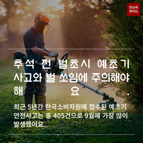 [컨슈머와이드-강진일 기자] 추석 전 벌초와 성묘 시 예초기·벌쏘임 사고에 각별히 주의해야 한다. 최근 5년간 한국소비자원에 접수된 예초기 안전사고는 총 405건으로 9월에 가장 많이 발생했다.