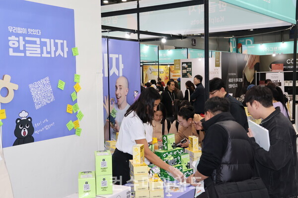 우선 화제성뿐 아니라 맛과 의미 그리고 지속가능성까지 담아낸 한글 과자 부스를 찾았다. 한글 과자는 미국 출신 방송인 타일러 라쉬와 인도 출신 사업가 니디 아그르왈이 작년 10월 9일 한글날 577돌을 기념해 만든 과자 브랜드다. 한글 과자를 위해 창업을 한 타일러와 니디는 지난 9월 4일 공식으로 한글 과자를 론칭했다. 한글 과자는 한글의 맛과 모양을 살리기 위한 타일러와 니디의 노력으로 탄생했다. 타일러와 니디는 한글 쿠키커터(과자 틀)를 직접 설계한 3D프린팅으로 개발했다. 다양한 문화권 소비자를 겨냥해 100% 식물성 원재료만 사용했다. HACCP 인증도 받았다. 지속가능성을 담기 위해 FSC 인증을 받은 친환경 패키징을 채택했다. 맛은 마늘과 쑥인데 단군신화에서 영감을 받았다.