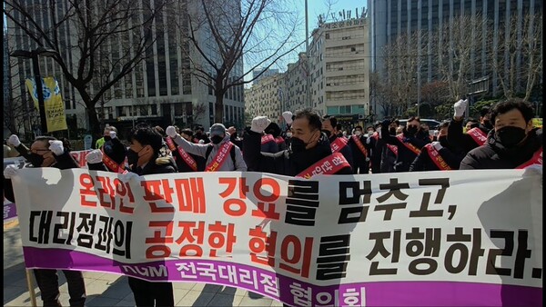 [컨슈머와이드-전휴성 기자] 대리점주들과 오토매니저들이 KGM의 대리점 죽이기 실상을 알렸다. 이들은 KG 사옥 앞에서 온라인 판매 정책 조정 및 대리점 지원 확대를 촉구하는 집회를 통해서다. 이들은 KGM이 대리점과의 상생 내용을 불성실하게 이행하고 있다고 폭로했다.