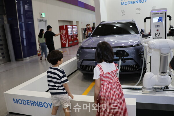 이날 오전 11시 EV트렌드코리아에 참가한 모던텍은 부스에서 전기차 로봇 충전 시연을 진행했다. 당시 남녀 어린이들이 신기한 듯 충전 로봇이 전기차에 충전하는 모습을 지켜봤다. 특히 남자 아이는 로봇팔이 전기차 충전 포트를 스스로 찾아 연결하자 깜짝 놀라며 좋아했다.