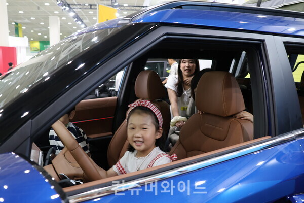 이날 KGM 부스에는 가족 단위 방문객들이 많았다. 관람객 수가 적다보니 아이들은 직접 전시차에 타보면서 즐겼다. 아이들 얼굴에는 환한 미소가 피어올랐다. 한 아이는 KGM의 전기차 앞에서 멋있는 포즈를 취하고 사진을 찍기도 했다.