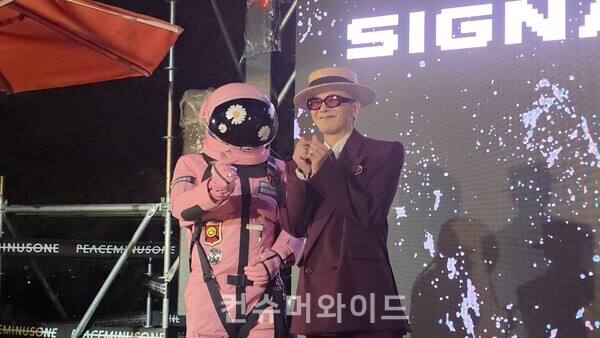 이날 행사는 패션브랜드 피스마이너스원(PEACEMINUSONE)’과 종합주류회사 ‘부루구루’가 협업하고 BGF리테일 ‘CU’가 유통한 피스마이너스원 하이볼의 론칭파티다. 당초 계획은 오후 7시 30분에 행사를 시작하는 것이었다. 그런데 이날 행사에 참석하기로 한 지드래곤이 사전 연락 없이 30분이나 행사장에 늦게 나타났다. 이로인해 행사는 44분 지연된 오후 8시 14분에 시작했다. 행사의 시작은 지드레곤의 기념 사진 촬영이다. 이후 지드래곤과 행사주추최측 주요 인사들의 기념 사진 촬영이 진행됐다.