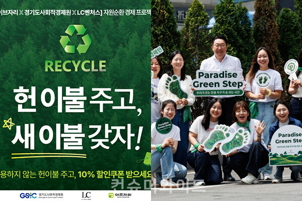 [컨슈머와이드-장하영 기자] 기업들이 친환경적 ESG 행보를 위해 업사이클링 캠페인과 그린 스텝 행사를 열었다. 이브자리는 헌 이불을 새로운 자원으로 살리는 순환경제 프로젝트를 경기도사회적경제원과 진행한다. 침구류를 수거해 다양한 업사이클 제품으로 제작해 판매한다. 파라다이스는 ESG 경영활동 파라다이스 그린 스텝 행사를 개최했다. 환경 정화 활동과 걸음 기부 캠페인 등이 실시됐다.