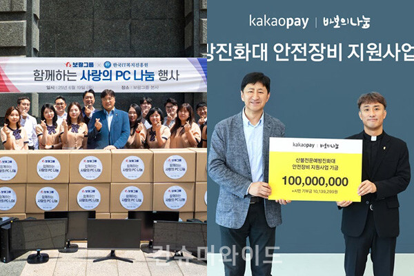 [컨슈머와이드-장하영 기자] 기업들이 ESG 실천을 위해 기부 활동을 실시했다. 보람그룹은 ‘사랑의 PC나눔’ 활동을 통해 300여 대의 PC와 주변기기를 한국IT복지진흥원에 기증했다. 컴퓨터 부품을 재활용해 기초생활수급 가정 등 IT 접근성이 낮은 취약계층에 전달할 예정이다. 카카오페이는 재단법인 바보의나눔과 함께 산불전문예방진화대를 위한 안전장비 지원기금 1억1000여만 원을 조성했다. 산불전문예방진화대 안전장비 지원을 위해 바보의나눔에 1억 원을 기부했다.