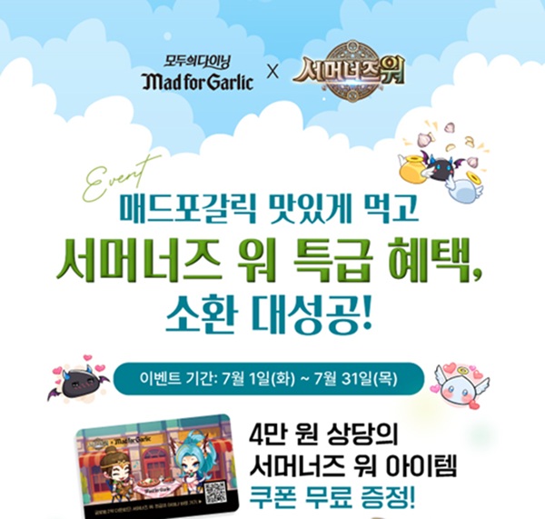 이달 31일까지 한 달간 진행되는 이번 프로모션의 내용을 살펴보면 우선 매드포갈릭은 매장을 방문하는 모든 고객들에게 약 4만 원 상당의 ‘서머너즈 워’ 게임 아이템 쿠폰을 증정한다. 해당 쿠폰은 결제 금액에 따라 차등 지급되며 2만 원 이상 결제 시 1장, 5만 원과 8만 원 이상 결제 시 각각 1장씩 추가된다. 쿠폰은 계정 당 최대 5회까지 등록 가능하다.