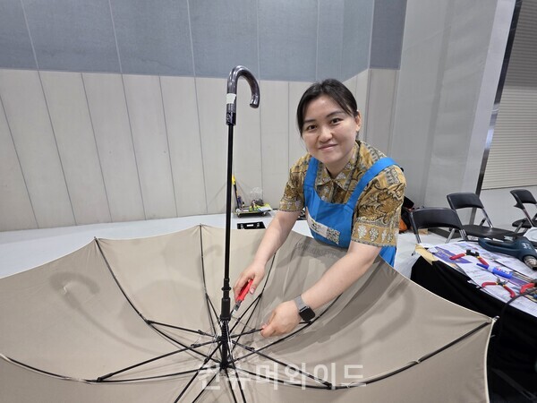 우산 수리하면서 힘든 부분에 대해 물어보자 모 작가는 “우산이 너무 다양하고 다르다는 것이 좀 힘들다”면서 “우산살이 부러진 것은 기존에 해체했던 우산에서 같은 살(부품)을 찾거나 아니면 최대한 길이가 맞는 살(부품)을 찾아서 우산에 맞게 다시 만들어서 사용한다. 우리의 우산 수리 방식은 100% 재생하는 방식, 자원순환 방식”이라고 설명했다.
