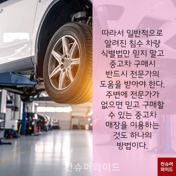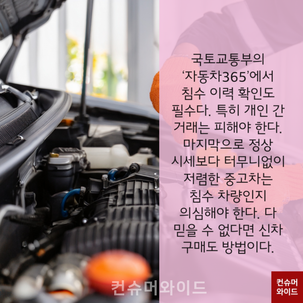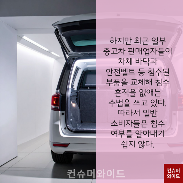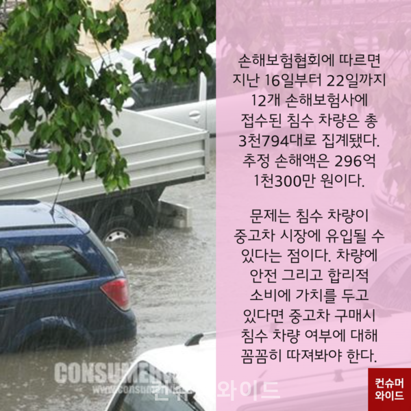 문제는 침수 차량이 중고차 시장에 유입될 수 있다는 점이다. 차량에 안전 그리고 합리적 소비에 가치를 두고 있다면 중고차 구매시 침수 차량 여부에 대해 꼼꼼히 따져봐야 한다. 침수 차량을 구매하지 않는 것이 안전 및 합리적 가치소비다.