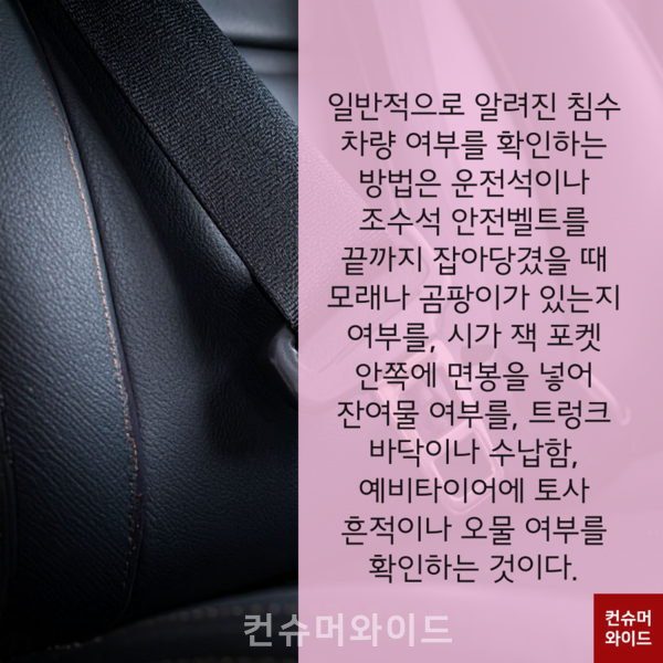 일반적으로 알려진 침수 차량 여부를 확인하는 방법은 운전석이나 조수석 안전벨트를 끝까지 잡아당겼을 때 모래나 곰팡이가 있는지 여부를, 시가 잭 포켓 안쪽에 면봉을 넣어 잔여물 여부를, 트렁크 바닥이나 수납함, 예비타이어에 토사 흔적이나 오물 여부를 확인하는 것이다.