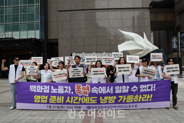 [컨슈머와이드-전휴성] “노동자도 사람이다. 냉방 차별 중단하라”, “ 백화점 원청은 즉각 영업 준비 시간에 에어컨을 가동하라” 31일 오전 10시 30분 서울 신세계 백화점 본점 앞에서 백화점 면세점 판매 노동자들이 30도가 넘는 폭염 속에서 목이 터져라 외쳤다. 이들이 현장에 나온 이유는 백화점의 고질병 중 하나인 냉방 차별 때문이다. 백화점 면세점 판매 노동자들이 원하는 것은 바로 백화점 면세점 판매 노동자 출근했을 때 법정 온도인 26도를 맞춰달라는 것이다. 백화점들은 냉방 차별을 하면서 겉으로는 상생, ESG 경영 등을 운운하고 있다. 과연 이같은 백화점의 냉방 차별 정책에 대해 상생, ESG 등에 가치를 두고 있는 가치소비자들이 어떤 선택을 할지 주목된다. 착한 소비 즉 가치소비의 의미가 중요해지는 대목이다.