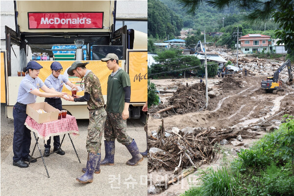 1일 한국맥도날드는 최근 집중호우 피해 지역인 경남 산청, 충남 예산, 경기 가평 지역의 복구 현장에 ‘행복의 버거’와 ‘맥카페’ 음료 트럭을 지원했다. 하루만 지원한 것이 아니라 지난달 25일부터 1일까지 총 5천 700인분의 버거와 음료(치즈버거 2천300개, 맥카페 커피 및 아이스티 3천400잔)를 서울시자원봉사센터 등을 통해 연일 40도에 육박하는 불볕더위 속에서 토사 정비, 침수 가구 정리, 세탁 봉사 등 수해 복구에 구슬땀을 흘리고 있는 군장병과 자원봉사자들에게 전달됐다.