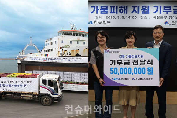 [컨슈머와이드-장하영 기자] 가뭄으로 물 부족을 겪는 강릉을 위해 기업과 공사 등이 기부를 통해 도움을 전달한다. LG생활건강은 먹는샘물 30만 병을 기부한다. 한국철도공사 노사는 대한적십자사에 기부금 5000만원을 전달했다. 기부금은 강릉지역 주민들의 피해 회복을 위해 생수 등 생필품 구입에 사용할 예정이다.