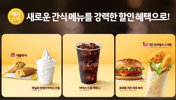 이번 해피 스낵 라인업은 1천500원, 2천 원, 3천 원으로 가성비 있게 즐길 수 있는 것이 특징이다. 전체 라인업은 ▲치킨 모짜렐라 스낵랩 ▲애플파이 ▲바닐라 선데이 아이스크림 ▲아이스 드립 커피(L) ▲토마토 치즈 비프 버거로 구성됐다. ▲애플파이 & 바닐라 선데이 아이스크림 ▲애플파이 & 아이스 드립 커피(L) 등 콤보 메뉴도 만나볼 수 있다.