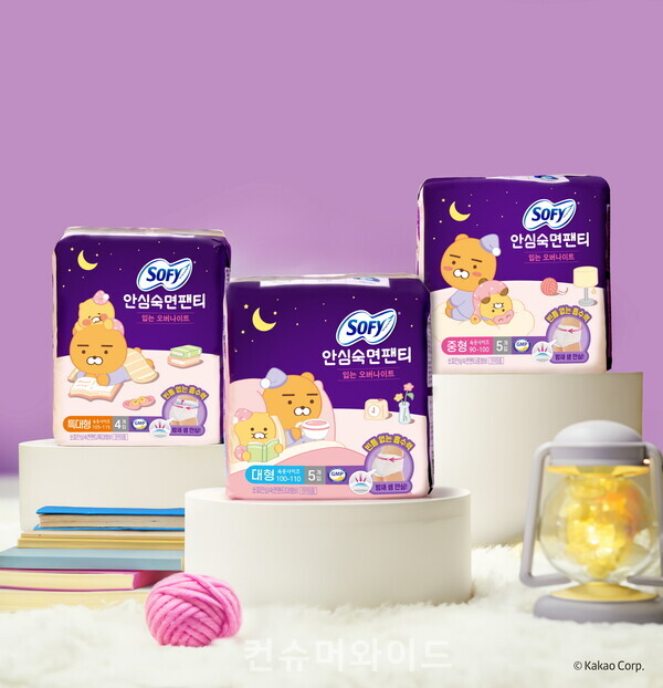 13일 엘지유니참에 따르면, 이번 콜라보 제품은 쏘피의 팬티형 생리대 ‘안심숙면팬티’로, 샘 걱정 없는 편안한 숙면을 할 수 있는 인기 제품이다. 이번 콜라보의 메인 콘셉트 주제는 ‘라이언과 춘식이의 편안한 밤’이다. 중형·대형·특대형 각 사이즈 별로 개성 있는 패키지 디자인이 적용됐다.