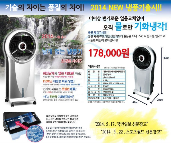 [컨슈머와이드-전진성 기자] 더운 여름 필수 아이템. 냉풍기. 기존의 날개형 냉풍기의 업그레이드 버전으로 대웅에서 날개없는 파워 에어쿨러 냉풍기를 출시해서 그 반응이 매우 뜨겁다. 크기는 더욱 커지고, 바람의 세기도 강해졌다. 기존 제품에 비해 바람의 세기가 1.6배에 달한다. 덕분에 더 시원하고 커버할 수 있는 공간이 넓어졌다.
