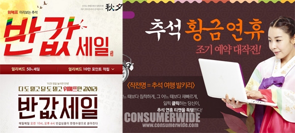 [컨슈머와이드-전휴성 기자] 소셜커머스 추석맞이가 시작됐다. 위메프와 쿠팡이 추석 맞이 특별 기획전을 준비한 것. 위메프가 실질적인 생활용품전을 준비한 데 반해 쿠팡은 추석연휴 여행에 포커스를 뒀다.