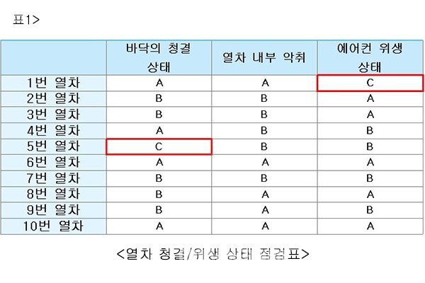 본지는 1호선 열차 10대를 직접 탑승하여 A(좋음), B(양호), C(나쁨)로 기준을 정하고 바닥의 청결 상태, 열차 내부 악취, 에어컨 위생 상태를 중점으로 확인했다.